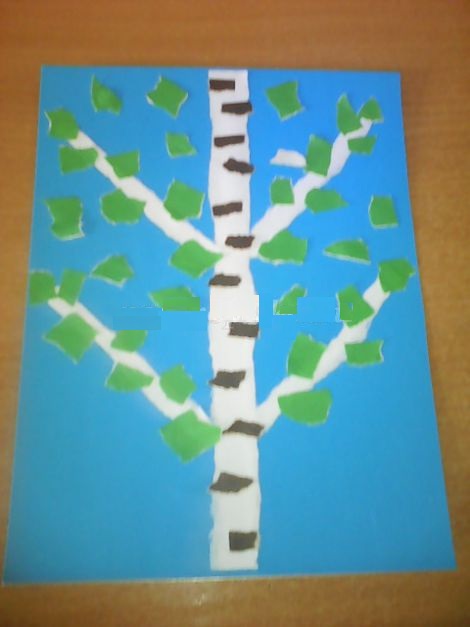 Ход работы: Приклеить к картону ствол березы. Карандашом дорисовать ветки.Из зеленой бумаги подготовить листья методом обрывания. Приклеить листья к дереву.